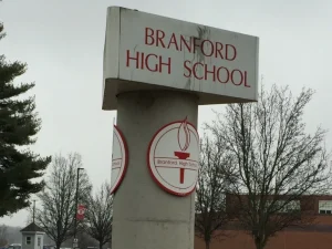 The new sign, a bright red rectangle with the words “Branford High School” imprinted, sits atop the thick round column of concrete.